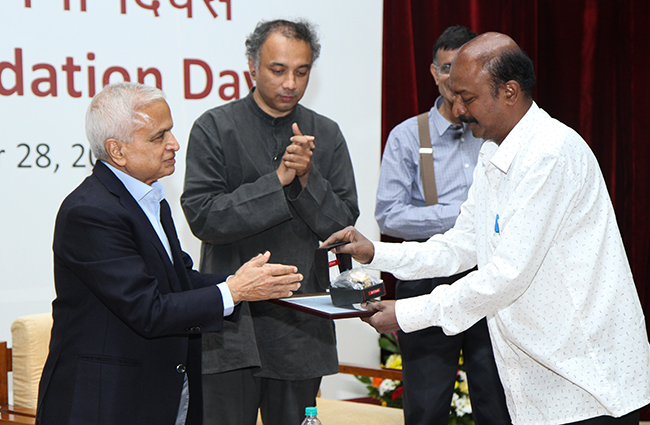 H S Rajanna, Junior Office Assistant, CAO’s Office, receives a Letter of Appreciation for completing 20 years of service at IIM Bangalore, from SN Agarwal, member, IIMB Board of Governors.
